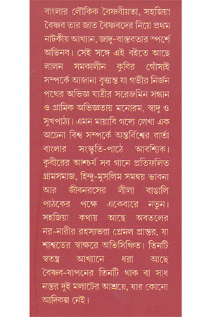 The first dramatic anecdote about the folkloric Vaishnavism of Bengal, Sahajia Vaishnava and caste Vaisnavas, is fancy at the touch of magic realism. Also in this book there is an unknown account of Gonsai, the contemporary Kubir. Kubir’s wonder is refreshing in all its songs, the village Muslim community, the Hindu-Muslim cohesive thinking and Lila’s life is completely new to the Bengali reader. The book contains three distinct narratives of Vaishnavism – three pursuit levels, which have no original imagination.